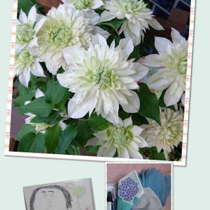 一緒に選んでくれたクレマチス 『花園』🎁 小さな花かと思いましたら咲き進むと大きな花に…🤍 30年前頃に描いてくれた私の顔☺お花もいっぱい🌷🌷 息子夫婦からはいつもお洒落な物🎁