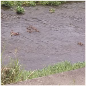 今日のお散歩… 🚶🏻♀️🦆…🚶🏻♀️…🚶🏻♀️… 先日📺で…カルガモの親子のお引越し見たばかり… ☔で増水した濁流の川をお母さん🦆の後を…必死について行ってました… ほのぼの感!!💞🤭🎶💯楽しい時間でした…🦆……… 何羽いるかな…遅れて2羽…、、……😀✋!!頑張れ…🦆………