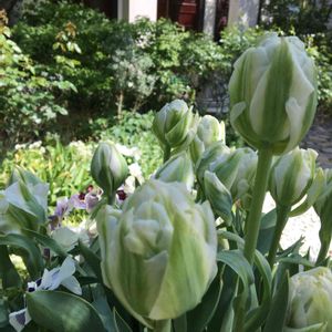 グリーンアイスクリーム🍨チューリップ🌷 3個植えて2つは開花できました。残りの1つは病気だったようで、花びらも葉っぱも斑入りで、開花直前にダメになりました。19日にpicしたものです💦 球根もすでに痛んでいたので土ごと処分しました。😂