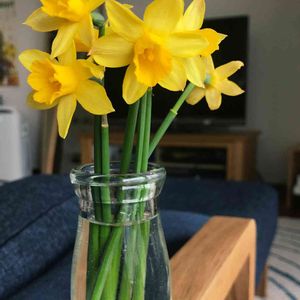 ミニ水仙テータテート(ティタティタ)。 もうすぐお花が終わりそうだったので、摘んでお部屋に連れてきました✨ 「テータテート」は、「頭を寄せ合って内緒話をする」という意味があるそうです😊🌱✨