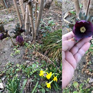 我が家の庭はまだ雑木林のように 殺風景です😅これからこの辺りは オルラヤ やホタルブクロが目立つ ようになるけど、今はまださみしいですね😅 今日の夕方庭を散策するとティタティタや濃い紫のクリスマスローズが咲いていました💕 クリスマスローズは下を向いているのでお顔を拝見😆💕 今日夕方咲いているのを見つけました^_^
