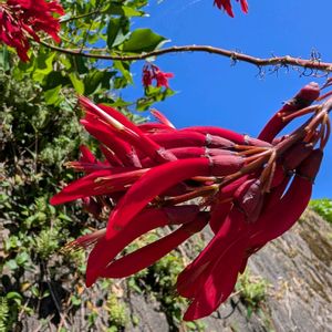 【Maui🏝️便り】 大きな木を見上げて… 《スライドpic》 ①、②ホウオウボク(鳳凰木)❤️ マメ科 別名・ロイヤル・ポインシアナ、 フランボヤン、 フレイム・ツリー、 火炎樹(カエンジュ) 由来・燃えるような鮮やかな花色、 伝説の鳥である鳳凰🐦🔥が飛翔する華やかな花姿より… 1枚目・下部に種子🤎が出来てイマス ③、④コウエンボク💛 (黄炎木・黄焔木 ) マメ科 別名・ジュンケイボク(盾柱木) イエロー・フレーム 由来・枝先に多数の黄色い花を咲 かせ、その鮮やかな花がまるで炎のように見えることから… ⭐️初めての出会いデス💓 ⑤朝7:01の海、空、🌴 正面に見えるのはラナイ(lanai)島 (ホテルベランダより🤳)