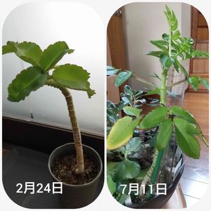 💚見違えちゃうなぁ…💚 園芸店の処分品だったこの子。 …ボクを育てて!… 冬のある日、家族になしました。 同属で寄せ植えてきたけれど、一番大きくなり葉が黄変。 5ヶ月足らずで、15㎝→35㎝に 生長😲驚💦 なんて、頼もしい子でしょう💕 個別に植え替えました😊 🏷️棒の日 ベンケイソウ科 カランコエ属 マザーリーフ セイロンベンケイソウ