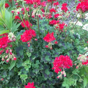 こちらの方は、もみじ葉ゼラニウムです。 鮮やかな赤色が、濃い緑の葉の色を際立たせてくれています。 紅葉のような葉はギザギザで普通のゼラニウムよりも小さいです。 地植えにしたらこんなに咲きました。 冬越しです。