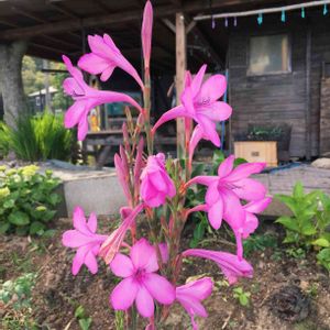 ピンクのワトソニアです。 今年は少し背が低いですがその分花をたくさんつけてくれました。 切り花にしても次々咲いてくれて長持ちの花です🌸かわいいです。