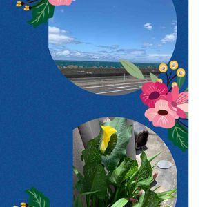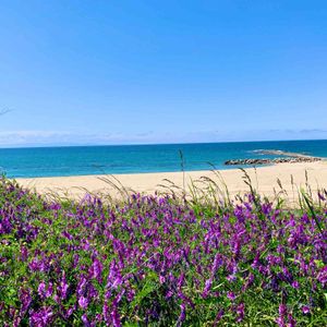 どこまでも広がる青い空と海、白い砂浜。 マメ科の植物でしょうか? 鮮やかな紫色が映えています😌