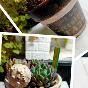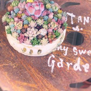 昨日の多肉狩りで ここのとこ、大好きになったコミックトム&ブルーエルフを買ってうちにあるものと 寄せ植え?しました😍 コミックトムの鉢は私のステンシルの先生の作品❤ ブルーエルフの鉢はシマムラで買ったんです🤩