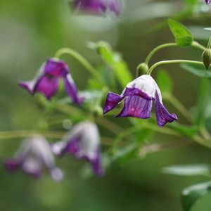 極小の花を咲かせるクレマチス・プシュケ。お花は2~3cmです。花弁の表(内側)が紫で、裏が薄紫の面白い花姿です。