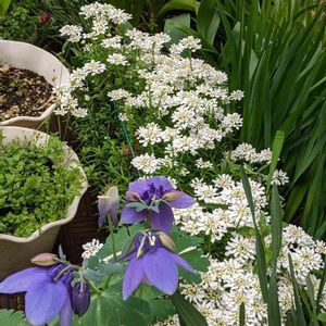 西洋オダマキさん。咲き始めました。これも種で飛んだ可愛いお花ちゃんです。 数年前にHCで見かけて即お迎えしたお気に入りのおだまきさんです。後ろのつぼみは、シラーです。😉😉😉