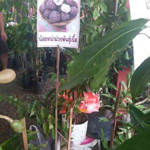 チェンマイの南西にあるサンパートン郡の土曜朝市の園芸店で、久々に赤実バンレイシの苗を見掛けました。 近年は市場で果実を見掛ける機会が減りつつありますが、果肉が滑らかなのと、果実が赤いので観賞価値もあり、根強い人気がある品種です。