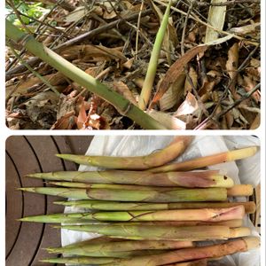 🟩根曲り竹(ねまがりだけ)🟩 根曲り竹を頂きました😊✨ 「ねまがりだけ」発音しづらい😅💦 姫竹とも呼ばれ、千島笹の若竹です❣️ 切り込みを入れて茹でてから皮を剥いて味噌和えでおいしくいただきました😋💕