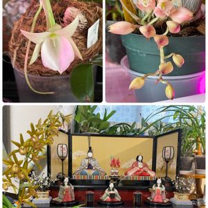 ひな祭りですね~?我が双子の娘のハピバです。たくさんの方々のご協力の元無事に産まれ、今では母になり多忙な毎日をすごせている事に感謝。娘3人が早く嫁がないように4月まで飾っていたのに、お相手を見つけて結婚しちゃったわ〜ꉂ🤣𐤔ꉂ🤣𐤔ꉂ🤣𐤔 上段 左 アングレカム・レオニス 昨晩から開花が始まりました。 右 クロウェシア レベッカ ノーザン‘ミッカビ’以前持っていた株が体調を崩したのでくろやなぎ農園さんから再購入。 共に香りの良い蘭~̋ ੯ꔷ̀͡ᓑ\クンクン 下段 ひな壇の横 和蘭 ‘’燎火”渋いお花が咲きました。ちょっと渋すぎだったかも…