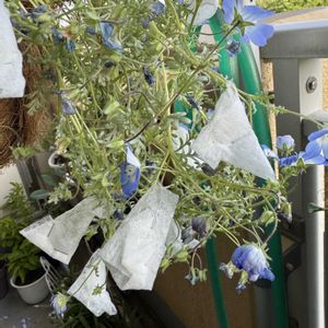 切って水に刺してるネモフィラ。 室外のベランダの方が花持ちいい気がする。 切り花からでも種取れる花種が あるそうだけど、ネモフィラも取れないかなぁ? 鉢植えや、ハンギング分は、 かなり乱れまくってて 突然変異で、白花と分かりやすく 枝分けしたように切り戻し分です。 種取れたら、また、来年の楽しみになるのだけど!😊🩷