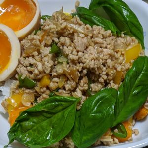 庭で収穫した甘長唐辛子を角切りして使用。ガパオライスにしました。直前に庭から採ってきたバシルの葉も乗せて(人*´∀`)。*゚+ 今年は紫蘇もバジルも葉が柔らかく香りがとても良くできて嬉しい( ꈍᴗꈍ)