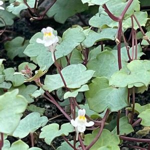 ツタバウンラン 石垣や家の土台に蔓延っています 何処から来るのか? レンガの間とか 土台に上手く場所を見つけ伸びて行きます 雑草扱いですが食べれるとか? ポリフェノールが沢山、、、、、、と言われるが食べる気にはなりません 花が可愛いから😍💕 それでも増え過ぎると間引きしながらお付き合いしています 今年は白🤍がやって来ました