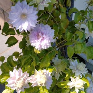 クレマチス ベルオブウォーキング 5年目の今シーズンはオベリスクの下から上まで満遍なく咲かせることが出来ました🤗 大きな八重のお花は見ごたえあります 幼苗から育てたので、2年目で初めて1輪だけ咲いて、段々と花数が増えて、やっとここまできました
