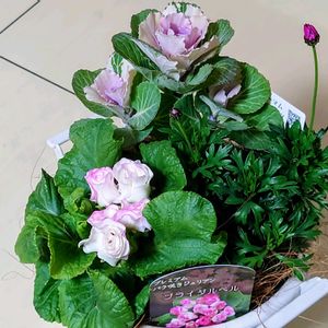 こちらは買ってきた苗でとりあえず作った寄せ植えです🌸🌿 材料は 葉牡丹 バラ咲きジュリアン・ブライダルベル ビジューマム・ローズクオーツ ピンク系統で揃えてみました😊 ビジューマムは、マーガレットとローダンセマムを掛け合わせた品種だそうです🌸 開花はまだですが、これがキレイで可愛いのです🌝開花後またアップしまーす👏