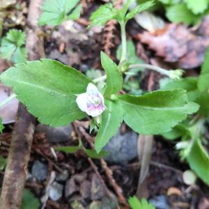 ニシノヤマクワガタ(サンインクワガタ) 湿った林で出会うオオイヌノフグリ似の花😃 花冠は4裂、淡紅白色を帯びて、基部の近くに紫条がある(1枚目) 果実は偏平な扇形で、4裂した萼に挟まれているのが名前の由来❇️ 当地にはヤマクワガタの分布はないとされる‥‥ 日当たりの良い場所に生えていた株は紫が濃かった(3、4枚目) 美しく青きドヨウ🏷️