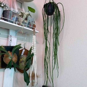 サボテンの仲間のリプサリスパラドクサ🌵 編み込んであるようなしっかりとした多肉質の葉は、1メートルにもなるくらい✨ 高めの位置から吊るしてあげると、オシャレで存在感がありますよ❤️ 直射日光の当たらない、明るく、風通しの良いところで育ててください。 水やりは表土が完全に乾いてから、たっぷりと!! 寒い冬の時期は断水気味で育ててください。 葉水は忘れずに☺️
