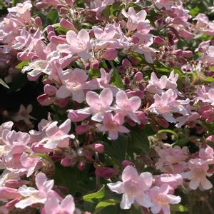 留守中に満開を見逃してしまった ショウキウツギ。 モモやトキワマンサクが終わった一角で もくもくの雲のようなピンクの花を 枝垂れさせています。
