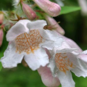 ショウキウツギ スイカズラ科ショウキウツギ属 落葉低木 中国南部原産 花後にできる果実が名前の由来で、鬼を滅する「鍾馗様(しょうきさま)」に似るから。 アベリアより大きく、ツクバネウツギの花に近い。 花期5〜6月 蕾はピンク色で開花すると白くなる。 釣鐘型をした花を2輪ずつ咲かせる。 内側の奥は黄色い模様が入り、花冠は5裂する。