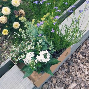 こんばんは✩︎⡱✧*。 またまた ご無沙汰の投稿になってしまいました〜Σ(,,ºΔº,,*) 今年もPWさんのアンバサダーをさせていただくことになりました どうぞ宜しくお願いします(⁎ᴗ͈ˬᴗ͈⁎) PW様、今年もありがとうございます(*´∀`*) 苗は5月20日に届きその日中に2つだけ植え込み、あとは今日までに植え込み終了しました〜。。。スーパーアリッサム パープルプリンセスを除きですけど。。。 アリッサムは届いた日から下葉が黄色くなっていて3日目にはお花もぐったりと('、3_ヽ<)_ 今は茎だけ状態ですけど枯れてはいないようなので、復活してくれるのを待ちます♫♫(*ฅ́˘ฅ̀*)♡ 水遣り代わりに今はメネデールをやってます(ㅅ˘˘)♡*.+゜ 𖧷スーパートレニア カタリーナ ピンクリバー 𖧷サンビタリア スタービーニ 𖧷ベゴニア グリーンダブレット ピンクバイカラー 𖧷スーパーアリッサム パープルプリンセス 𖧷ユーフォルビア ダイヤモンドスノー 𖧷スーパーチュニア ブルーモーンプラス 𖧷スーパーベル レモンスライス 𖧷スーパーベル リッチ イエロー 𖧷スーパーサルビア ロックンロール ブルーティアーズ 去年と同じお花もありますが何故か黄色多めですね💦💦 黄色いお花は大好きなのですが♫♫ 寄せ鉢にしてどれと合わせても合うようにと思い、黄色系やパープル系が多くなってしまいました♫ 梅雨の中休みの今日、少し前に投稿したメカルドニアを株分けしてサンビタリアと寄せ植えしたり、鶯のさえずりを聞きながら暑い中頑張りました|•'-'•)و✧ スーパーベルは直径20cmの鉢ですが先ではもう少し大きいサイズにチェンジするかも💭💭 植込み後お花と蕾は全て取ってます 用土∗∗∗前回と同じ園芸店の培養土に 赤玉小粒 バーク堆肥プラス 元肥は今回は YAMATO「花と緑を育てる元肥」 N6 P40 K6+ Mg19 どうか梅雨に負けずモリモリになりますように〜(*˘︶˘人)♥*。+