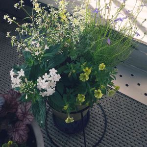 🍃ꕤ*。゚寄せ植えꕤ*。゚🍃 こんにちは·͜·♡ ペチュニア・パニエレモン🍋がようやく咲き揃ってきました。この透明感が大好きです❣️ 🌿ホワイトソルトブッシュ少し剪定✂️しましたが、もう少し切ってみようかな?リッピアは直ぐに伸びるからミニトレリスに絡めて遊びます🎶 ꕤ*.゚ユーフォルビアの位置は白いバーベナを植えていましたが、パニエの開花を待たずハダニ被害で衰弱し、只今養生中です🏥 今年はハダニで何度も泣かされています💧思い切って植え替えもありですね❣️ ・ペチュニアパニエレモン ・ホワイトソルトブッシュ ・ユーフォルビアダイアモンドスノー ・リッピア