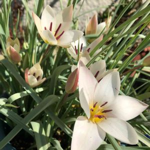 原種系チューリップ レディジェーン🌷 蕾時の縞のピンク色が 少し薄い様に 思います。 芽がでず 心配していた鉢は 蕾も出てきてます。 おうちのお花で 春を 楽しみたいですね💕
