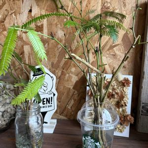 お気に入りの🌿 エバーフレッシュですが 大きな葉っぱが出て頭でっかち👀 幹を太くしたいのと 枝を出して欲しいので 思いきって剪定✂️ 切った枝は水差しに💧