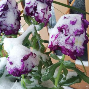 玄関の寄せ植えにも雪❄️が積もりました。ストックの雪化粧のお顔はべっぴんとは言い難い…🤭 朝30cm近く積雪あり雪かきしてきましたが今は吹雪🌨️🌀( p′︵‵。)