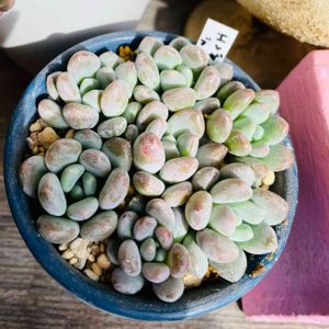 以前旦那がデザインフェスタで見つけた可愛いミニ鉢に、大きくなった葉挿したちを寄せ植え💕 ピンセットぐらいの高さでしっかり水捌けもついてる優秀な鉢です 鉢の色合い見た時から生育期入るの楽しみに待ってました(*´ω`*)やはりエレガンスブルーとても似合う! 親葉の取れたブロンズ姫葉挿しも混ぜてむぎゅむぎゅ皆で水吸う作戦。どちらも上に伸びる品種なので成長後も待ち遠しいです☺️ エレガンスブルーは元から小さいけど発芽率高いし4ヶ月経っても親葉全然縮まなくて本当に葉挿し向き✨