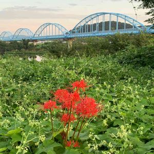 今朝は加古川の河川敷へウォーキング! 水管橋を背景に"アレチウリ"の中で、真っ赤な"ヒガンバナ"が秋を競っていました。