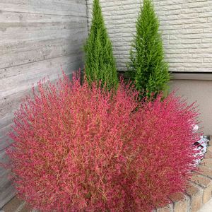 ウォーキングの途中、あるお宅の玄関脇にて! 奥の"ゴールドクレスト"の緑と"手前の"コキア"の赤が、見事なコントラストを演出していました。