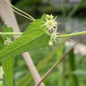 今朝のウォーキングの途中、加古川の河川敷で見つけた地味な花! どなたか名前を教えてください🙇♀️ 真理さんに教えていただき"アレチウリ"とわかりました😊