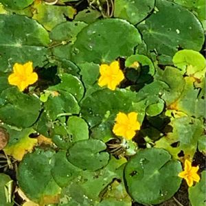 台風🌪一過のウォーキング! 泊川"スイレン"の葉っぱ🌿に似た"キュウリ"に似た黄色い花を見つけました。 調べた結果は"アサザ"でした‼️