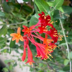 今朝のウォーキングの途中で見かけました。 初めて見る花です‼️ "ハニーサックル"という名前です。