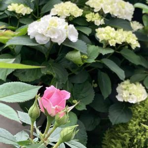 こんにちは😃 午前中の霧雨も上がり薄陽がさしてます ミニバラのピンクの蕾と紫陽花の白がとっても綺麗です
