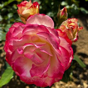 【薔薇】《バラ科》 「キャンディ・メイディランド」 仏 メイアン 2006年作出 咲き始めのしべの黄色が退色すると中心の白が浮き出て大変美しいです。 花もちが良い、一重の可愛らしい花が、株を覆うように咲きます。 植え付け当初から樹勢が良く、枝がしなやかにふんわりと横に這うので、 小さなスペースでも楽しめます。 四季咲き性で黒星病・うどんこ病に強く、耐暑性、 耐寒性もあり、丈夫で育てやすい品種です。 2006年マドリード金賞、2007年チェコ銀賞、2008年ADR他多数受賞歴あり。 2011年長崎ハウステンボスで行われたローズペイザージュ国際バラコンクールでは ハウステンボス特別賞(総合優勝) ローズペイザージュ特別賞・ローズペイザージュ部門金賞を受賞しました。
