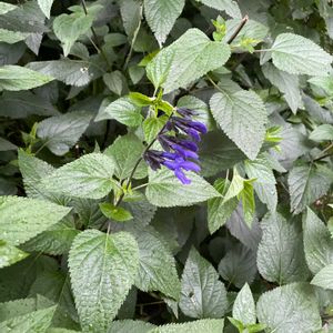 散歩道🚶♀️🚶♀️曇り☂️ 緑道脇に咲く 「メドーセージ」 怪獣顔です🎶🎶