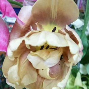二輪かさなっているのかと思いきや、これで一輪。少し前からいる切り花チューリップなのですが、よくみたら雄しべが変なところから出ていたり、内側の花びらと雄しべがまだくっついていたり。 こういうこともあるんですね