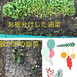 頂いた「油菜の種」我が家のは 違った液肥を1週間おきに掛けたのがいけなかったのが⁉️ 成長が止まってしまいました 雨も少なくて でも、お裾分けしたお宅の油菜はモリモリです 一つもじいて味見されていました、甘いって 下手ピーが育てるとコレです 隣のほうれん草も駄目 又、蒔き直しました😅😂