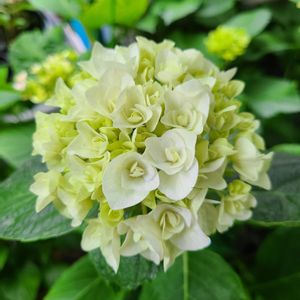 紫陽花 ポージーブーケエリーが咲きました。白•黄緑色ですがこれから色ずいて行きます。 今回、土の酸土調整してないので何色になるんだろう❓️