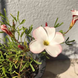 オキザリス・パーシーカラーの花が、開きました🌸 淡いピンクの花が 陽射しを受けてニコニコ🥰 紅い縁取りが見えなくなって〜華やかさ半減💞