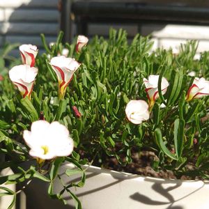 オキザリスパーシーカラー❣️🤍😍 花言葉 光輝く心✨ 日が当たると微笑むように花開く姿も 素敵ですが、紅白の捻り加減が可愛らしいですね❣️🤍 長野のファームで購入 今は、お一人様です😍 今度行ったらお仲間を作ってあげたい❣️🤍 今日も笑顔の一日を🎶🍀🤗