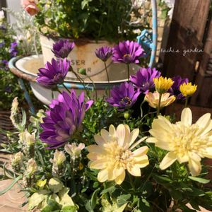 おはようございます☀ 一重&二重のオステオスペルマムさんの寄せ植え💛💜 日光浴姿が可愛いです😍 今日も素敵な一日となりますように✨