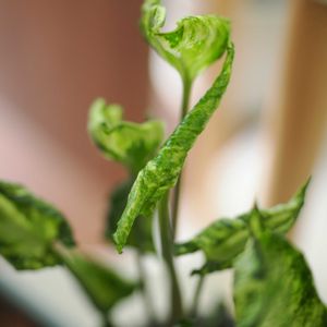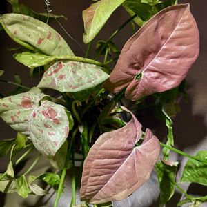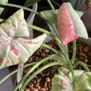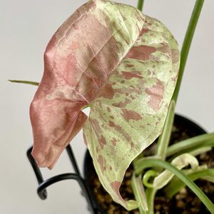 シンゴニウム ミルクコンフェッティ なんかすごい葉が出てきた❣️半分ピンクで半分緑🎶 おもしろーい😆