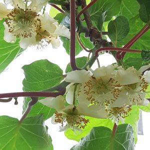 我が家の「キウイフルーツ」これはキウイのお花です。うちのは「グリーンキウイ」🥝 花言葉「生命力」「豊富」 11月中旬ぐらいから収穫出来ます。
