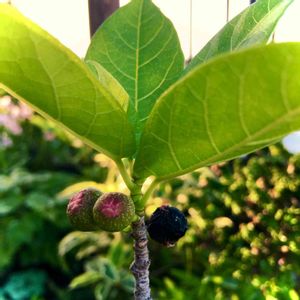 もしかしたら大木になった南国の果実🥭にでも見えませんか❓ わが小庭の劣等生イヌビワが頑張って3つも実をつけています。1つは萎びて枯れてるけど、偉い!頑張れば出来る‼️ ひとつの実は1cmくらいです🥰