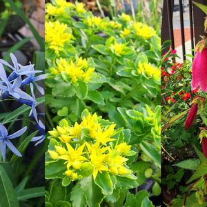 カラフル山野草トリオです❣️ 地味な色が多い小庭で、珍しくはっきりとした色が揃いました。 青💙はチョウジソウ 黄💛はキリンソウ 赤❤️はホタルブクロ 🚥🏃♂️🏃🏃♀️