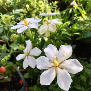今日のお花🏷⸒⸒クチナシさん 今シーズン3回目の登場になってしまいました。 まだツボミがあります。一才クチナシなので高さ15cmより大きくなりませんが花は1人前の大きさです❣️実もなります。ほっぺたに花粉をつけちゃって😍かわいいね